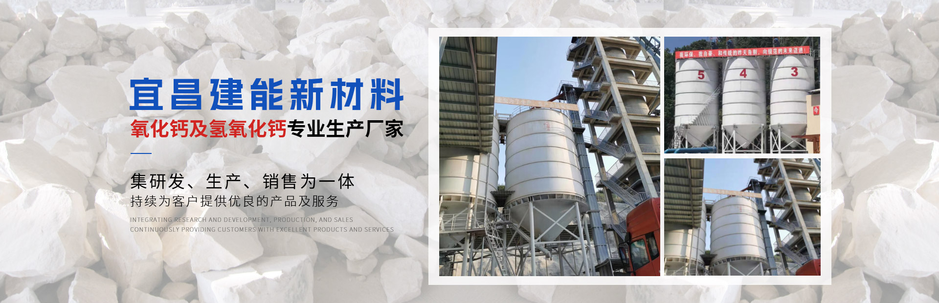 宜昌建能新材料有限公司 地址位于湖北省宜都市姚家店鎮(zhèn)油榨坪村二組,交通便利。我們公司是一家專(zhuān)業(yè)從事石灰研發(fā)、生產(chǎn)、銷(xiāo)售為一體的高科技生產(chǎn)型企業(yè)。公司采用優(yōu)良石頭資源,出產(chǎn)的石灰品質(zhì)優(yōu)良,主要經(jīng)營(yíng)產(chǎn)品有石灰石、石灰塊、石灰石粉、氧化鈣、氫氧化鈣、母料專(zhuān)用灰鈣粉、建筑用石、方解石粉、重晶石粉等。 公司生產(chǎn)的石灰、碎石等產(chǎn)品,以?xún)?yōu)良的產(chǎn)品質(zhì)量,獲得了不少客戶(hù)的信任。 公司秉承“誠(chéng)信、優(yōu)質(zhì)、共贏”的經(jīng)營(yíng)理念,堅(jiān)持用戶(hù)至上、服務(wù)優(yōu)先原則,用心解除客戶(hù)所憂(yōu);以科技服務(wù)和好的產(chǎn)品服務(wù)客戶(hù);始終堅(jiān)持以“想顧客之所想,急顧客之所急”的經(jīng)營(yíng)理念,不斷前行......